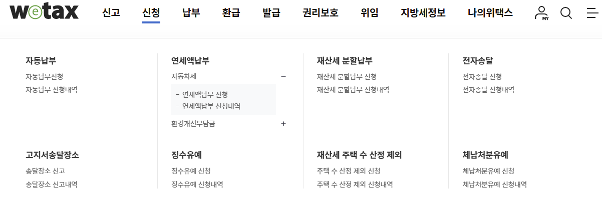 위택스(www.wetax.go.kr) 홈페이지에서 다음과 같이 신청할 수 있습니다: